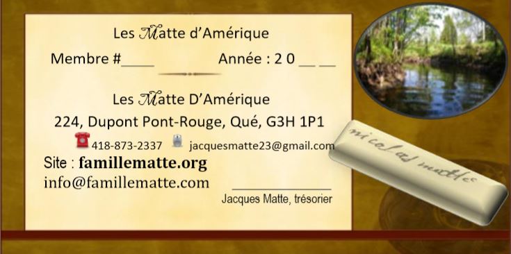 Si vous ailleurs au Québec, au Canada et aux États-Unis vous connaissiez des amis portant le nom Matte, faites leur savoir que leur Association a besoin de membres aussi qualifiés que vous êtes. Jetez un coup d'œil sur le site : famillematte.com et remplissez la formule d'adhésion, rien de plus facile peu importe l'âge ou l'endroit. Soyez connu des quelques descendants de la 9e et plus de la 10e, 11e et même 12e génération, notre futur.