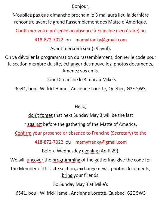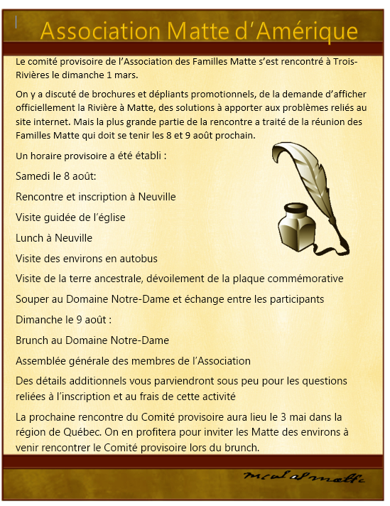 Que vous soyez un Matte ou conjointes ou conjoints, parents, amis, il leur fera plaisir de s'assoir avec vous le mardi 30 septembre à la salle Plamondon, de l'hôtel de ville de Neuville, 230 rue du Père Rhéaume pour 19 h 30. Merci d'accepter cette invitation. Nous y parlerons d'information, du site Web bilingue de l'Association, des futures rencontres et plus. Au plaisir.